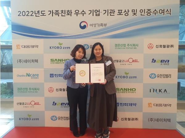 ‘가족친화인증제도’는 ‘가족친화 사회환경의 조성 촉진에 관한 법률’ 제15조에 따라 여성가족부가 가족친화경영 양성을 위해 마련한 제도다. 일과 가정생활을 조화롭게 병행할 수 있도록 자녀 출산 및 양육지원, 유연근무제, 가족 친화 직장문화 조성 등 여러 가지 가족 친화적인 제도를 모범적으로 운영하는 기관을 대상으로 인증을 부여한다.