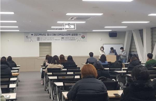 이번 설명회는 ‘2023년도 정시 특징 및 분석 성적대별 지원전략’을 주제로, 현직 교사(한양대학교사범대학부설고등학교)이자 EBS 입시전문가로 활동하고 있는 윤윤구 강사가 진행했으며, 수능성적 발표 이후 입시 관련 정보가 필요한 학생 및 학부모에게 큰 도움이 됐다.