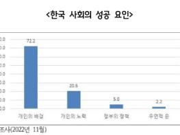 연구원은 지난 11월 8일부터 11일까지 수도권 성인 1천31명을 대상으로 한국 사회에서 대학 진학, 취업, 소득이나 부 등 사회경제적 성취가 어떤 요인에 의해서 가장 많이 영향을 받는다고 생각하느냐 질문했고, 수도권 성인의 72.2%(744명)가 개인의 배경을 형성하는 환경(부모의 학력이나 소득 등)이라고 응답했다. 반면 개인의 노력은 20.6%(212명)에 불과했고, 정부의 노력은 5.0%(52명), 우연한 운은 2.2%(23명)로 나타났다.