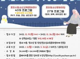 [한국뉴스타임=편집국] 포천시 청소년수련시설(포천시청소년교육문화센터, 포천청소년문화의집)은 포천시 청소년들을 대상으로 건전한 여가생활을 위한 2023년 1분기 꿈키움(정규)·창의교육 프로그램 수강생을 모집한다.