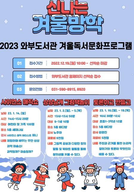 남양주시 와부도서관 관계자는 “이번 프로그램을 통해 겨울방학을 맞은 어린이들이 유익한 지식과 정보를 배울 뿐만 아니라 가족과 즐거운 시간을 보내면서 책과 더 친해질 수 있는 계기가 되길 바란다.”라고 밝혔다.