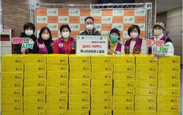 [한국뉴스타임=편집국] 국제라이온스협회354-H지구 개나리라이온스클럽(회장 최순옥L(라이온))은 지난 13일 지역 사회의 어려운 이웃을 위해 귤 5kg 100박스(130만 원 상당)를 남양주시 남부희망케어센터에 기탁했다.
