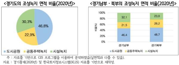 2020년 기준 경기도 내 조성녹지는 208.8㎢로 도시공원 97.8㎢, 시설녹지 63.2㎢, 아파트(공동주택단지) 녹지 47.7㎢로 구성됐다. 아파트 녹지 면적은 오산시 면적(42.7㎢) 보다 크며, 여의도 면적(2.9㎢)의 16배를 넘는다.
