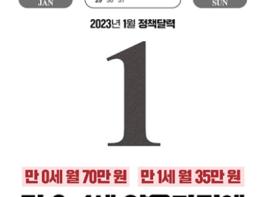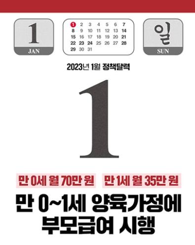 1월부터 만 0세 아동에게 월 70만 원의 부모급여를 지급하며?만 1세 아동에 대해서는 2023년 월 35만 원, 2024년에는 월 50만 원을 지급