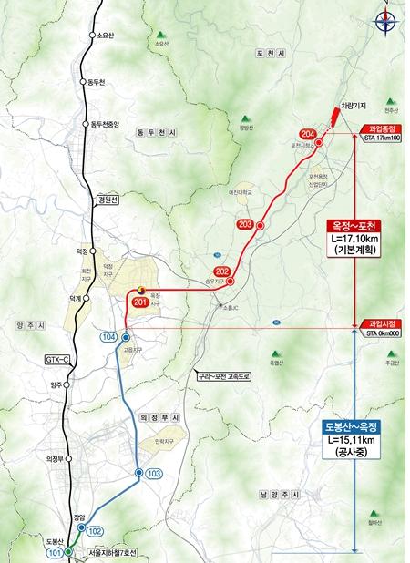 ‘옥정-포천 광역철도 건설’ 사업은 서울 지하철 7호선을 포천까지 연결하는 사업으로, 양주 고읍동에서 포천 군내면을 잇는 17.1km 구간에 총사업비로 1조 3,370억원이 투입돼 정거장 4개소(포천 3개소, 양주 1개소)와 차량기지 1개소가 설치될 계획이다.