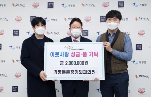 [한국뉴스타임=편집국] 설 명절을 앞두고 어려운 이웃을 위한 나눔 행렬이 이어지고 있는 가운데, 1월 4일 ‘가평 튼튼 정형외과의원’에서는 추운 겨울 어려운 이웃들과 따뜻한 온정을 나누기 위해 이웃돕기 성금 2백만 원을 군에 기탁하여 전달식을 가졌다.