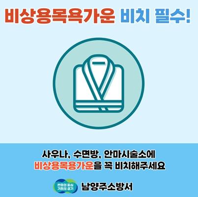 [한국뉴스타임=편집국] 남양주소방서는 사우나, 수면방 등에 화재 발생 시 신속하고 안전한 대피를 위한 비상용 목욕가운 비치 독려를 홍보 중이다.