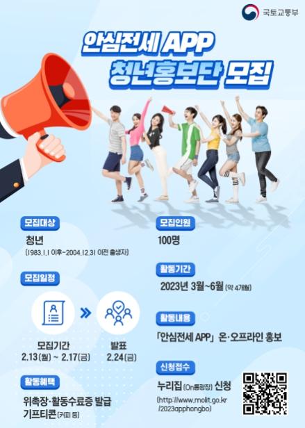 ?안심전세 App? 청년홍보단 모집은 2월 13일부터 2월 17일까지 5일간 국토교통부 누리집에서 진행된다.