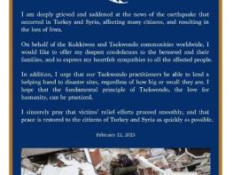 [한국뉴스타임=편집국] '세계태권도본부' 국기원 이동섭원장이 2월12일 전 세계 태권도인을 대표해 튀르키예 시리아 지진으로 희생당한 분들의 명복을 빌며 유족들과 피해를 입은 분들께 애도와 위로를 보낸다고 밝혔다.