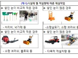 ‘후속제설 업무수행요령’은 주요 도로 제설 이후 골목길, 버스정류장, 보행로, 공원 등의 제설 미흡으로 인한 사고 발생을 최소화하고, 보행 공간 내 국민 불편이 발생하지 않도록 제설 방법, 제설제 비치 등을 규정했다.