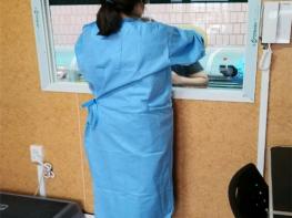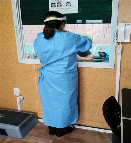도보이동진료소는 환자와 의료진 사이를 아크릴판으로 가로막은 상태에서 공정형 라텍스 장갑을 착용하고 검사를 진행하는 비대면 방식이다.