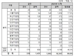 지역별 발주량을 보면, 총액계약 대상 843억 원 중 본청이 189억 원으로 22.4%를 집행하고 서울청 등 11개 지방청에서 654억 원을 각각 집행할 예정이다.