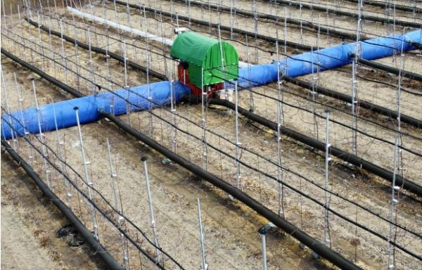 연구진은 열전달 효율을 높일 수 있도록 과수원 중앙 부분에 온풍기를 설치했다. 그리고 농작업에 방해받지 않도록 50~60도의 따뜻한 바람을 내보내는 통로를 나무가 심어진 줄에 나란히 설치했다. 통로의 천(필름)은 열 견딤성(내열)·마모 견딤성(내마모성) 원단을 사용해 열 손실은 최소화하면서도 열이 과수원 안에 고르게 퍼지도록 했다.