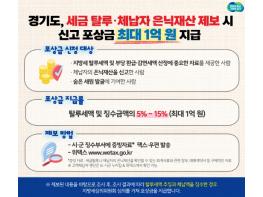 [한국뉴스타임=편집국] 경기도는 지방세 탈루 세액이나 체납자의 은닉재산을 신고하는 제보자에게 포상금 최대 1억 원을 지급한다고 19일 밝혔다.