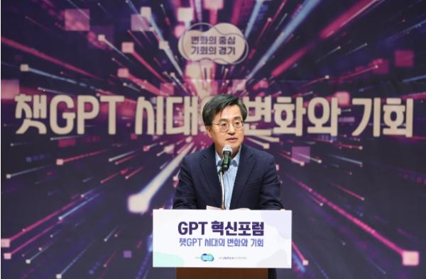 김동연 경기도지사는 이날 챗GPT-4가 작성한 개회사를 낭독해 눈길을 끌었다. 이 개회사는 김 지사가 ‘챗GPT-4’ 생성형 인공지능 모델에게 “너는 대한민국 경기도지사야. 경기도에서 지피티를 활용해 도민의 인공지능 활용 권리를 확대하려고 해. (중략) 이런 정책을 중심으로 한 연설문을 써”라고 요청한 뒤 나온 답변이다.