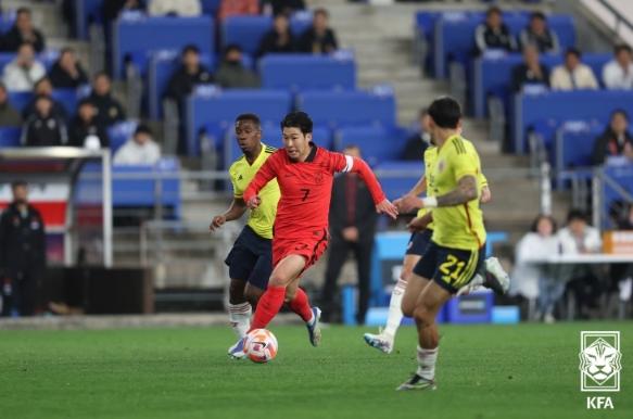 손흥민은 24일 울산문수축구경기장에서 열린 콜롬비아와의 A매치 친선경기에 선발 출전해 풀타임 활약했다. 한국이 기록한 두 골은 모두 손흥민의 발에서 나왔다. 전반 10분에는 골키퍼가 자리를 비운 골문에 왼발로 차 넣었고, 전반 추가시간에는 수비벽을 절묘하게 피하는 오른발 프리킥을 꽂아넣었다.