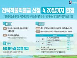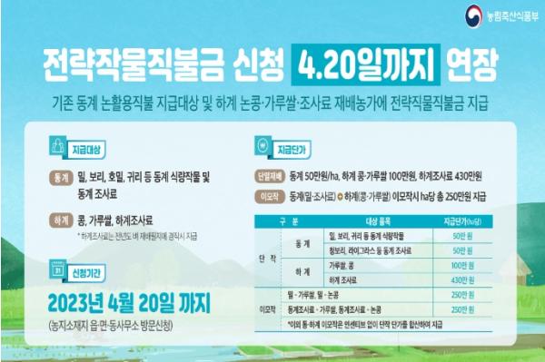 [한국뉴스타임=편집국] 농림축산식품부는 전략작물직불금 등록 신청 기간을 당초 3월 31일에서 4월 20일까지 연장한다고 밝혔다.
