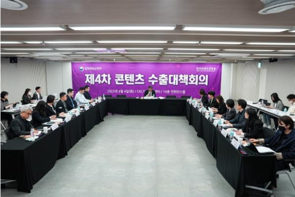 [한국뉴스타임=편집국] 문화체육관광부는 4월 4일, 한국콘텐츠진흥원 광화문분원에서 전병극 제1차관 주재로 ‘제4차 콘텐츠 수출대책회의’를 열어 K-콘텐츠 창업과 금융투자 지원방안을 논의했다.