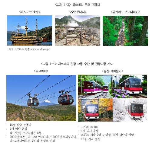 일본의 하코네 국립공원은 산악·온천·호수가 어우러진 관광지역으로서 철도·등산버스·관광버스·케이블카·로프웨이·등산열차·유람선 등 다양한 관광교통 수단이 연계되어 있습니다. 하코네의 주요 정거장 주변에는 온천·화원·조각공원·박물관·미술관 등이 산재되어 있으며, 대중교통수단으로도 지역 내를 두루 살필 수 있어 역내의 자동차 유입을 억제하는 수단으로 활용되고 있습니다.