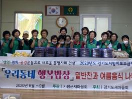 가평군새마을회(회장 김성우)는 지난 6월 30일 청평면종합복지회관에서 청평면부녀회(회장 양화자)원 20여명과 함께 2020년도 경기도 지방비 보조금 지원사업인 『우리동네 행복밥상』밑반찬과 여름음식 나누기 운동을 펼쳤다.