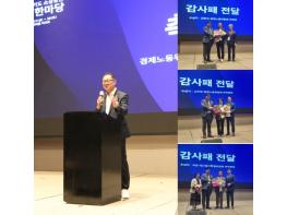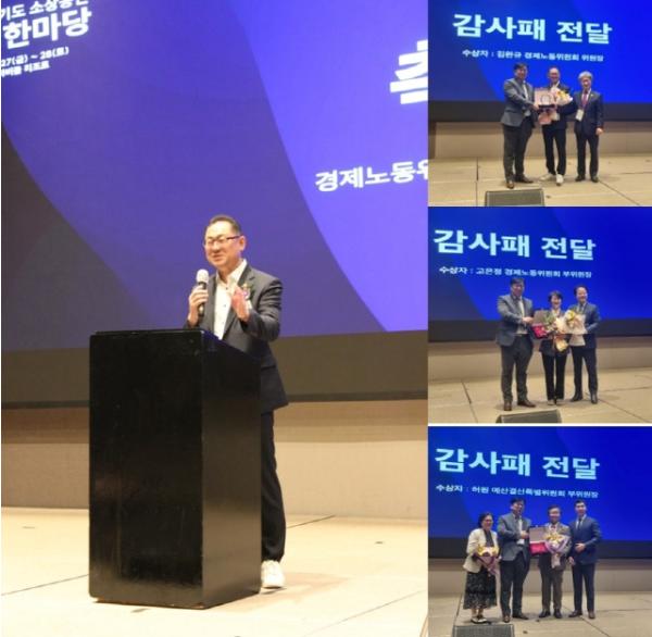[한국뉴스타임=편집국] 27일 화성시 라비돌리조트에서 ‘2023 경기도 소상공인 상생한마당 개막식’이 개최됐다. 이 행사에서 경기도의회 경제노동위원회 김완규 위원장(국민의힘, 고양12)을 비롯하여 고은정 부위원장(더불어민주당, 고양10)과 예결산특별위원회 허원 부위원장(국민의힘, 이천2) 등이 경기도 소상공인을 위한 열정적인 의정 활동으로 감사패를 수상했다.