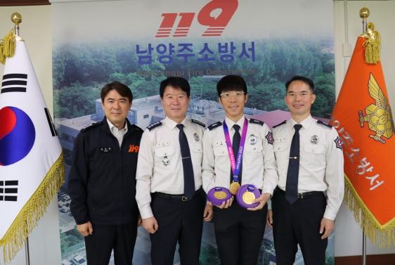 조창근 서장은 “소방공무원으로 근무하는 여건속에서 꾸준한 체력관리로 아시아경기대회에 장애인 경기 파트너로 참가하여 3관왕이라는 좋은 결과까지 가지고 돌아와 너무 기쁘고 진심으로 축하드린다”고 말했고 윤중헌 소방사는 “우리나라를 대표하여 아시아경기대회에 참가한 것만으로 큰 영광으로 생각하고 경기에서도 파트너와 좋은 호흡으로 1위를 할 수 있었다”고 말했다.
