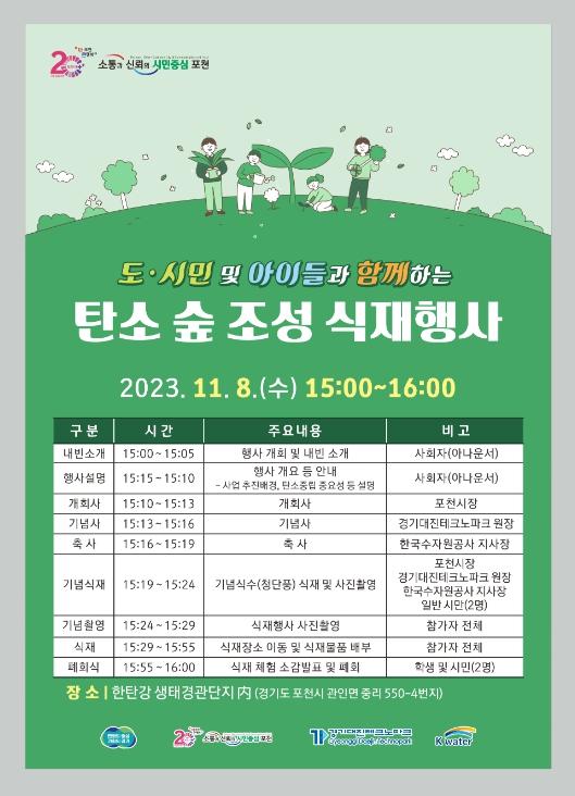 탄소 숲 조성 식재행사는 포천시가 경기도 '2023년 온실가스 감축 실천활동 공모'에 선정, 사업비 총 2억 원을 (재)경기대진테크노파크에 위탁해 추진하는 탄소 숲 조성 사업의 일환으로 추진한다.