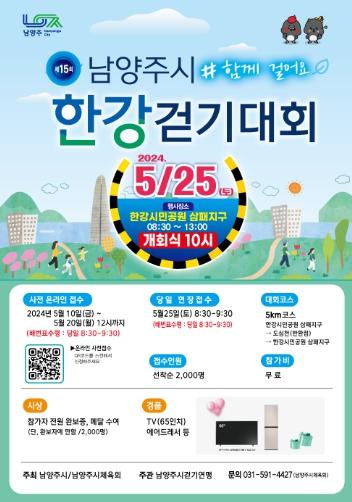 [한국뉴스타임=편집국] 남양주시와 남양주시체육회가 주최하고 남양주시걷기연맹이 주관하는 ‘2024년 제15회 남양주시 한강 걷기대회’가 오는 25일 한강시민공원 삼패지구 일원에서 개최된다.