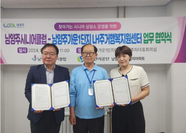 이번 협약을 통해 남양주시니어클럽은 남양주가운1단지 LH주거행복지원센터 내에 ‘찾아가는 시니어 상담소’를 설치하고, 노인생산품 홍보 및 다양한 분야의 노인일자리에 대한 상담 서비스를 제공할 예정이다.