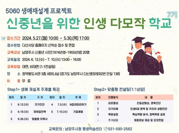 [한국뉴스타임=편집국] 남양주시는 중장년의 새로운 인생준비와 안정적인 노후 생활을 위한 생애 재설계 교육 과정인 인생다모작학교 7기를 다음 달 12일 개강한다.