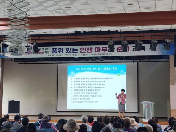 [한국뉴스타임=편집국] 구리시는 5월 22일 구리시 노인복지관 대강당에서 복지관 이용자를 대상으로 ‘웰다잉(Well-Dying) 인식확산 교육 특강’을 진행했다.