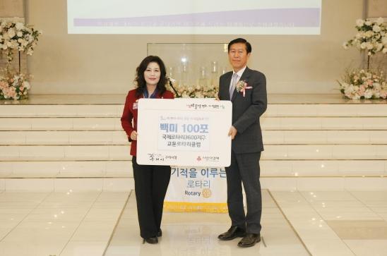 이번 기부에서는 제39대 안병학 회장의 이임식과 제40대 이지연 회장의 취임식을 맞아 관내 취약계층을 위한 백미 100포를 기부했고, 전달받은 백미는 교문1동 소재의 경로당과 지체장애인협회 및 경로식당에 배부될 예정이다.