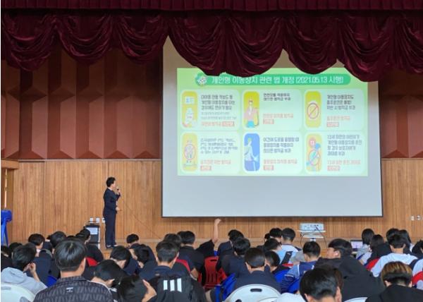 교육 내용은 △전동킥보드 안전 이용 및 운전방법 △원동기장치자전거면허 필수 소지 강조 △무면허 운전시 처벌규정 △도로교통법 준수 등으로, 특히 안전수칙 미준수로 발생한 다양한 교통사고 사례를 영상으로 보여주어 학생들의 경각심을 일깨웠다.