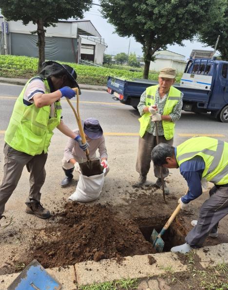 이날 윤정아 가산면장을 비롯해 가산면 행정복지센터 직원, 가로환경미화원, 기간제근로자 등은 청소차 3대를 동원해 침수 피해가 우려되는 가산면 주요 도로인 가산 2교차로부터 고인돌사거리까지 막힌 배수로를 뚫고 도로변 쓰레기와 토사 등을 제거했다.