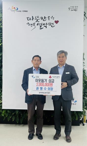 [한국뉴스타임=편집국] 가평군 설악면 천안1리 권형수 이장이 최근 설악면 행정복지센터를 방문해 관내 어려운 이웃을 돕기 위한 성금 200만 원을 기탁했다.