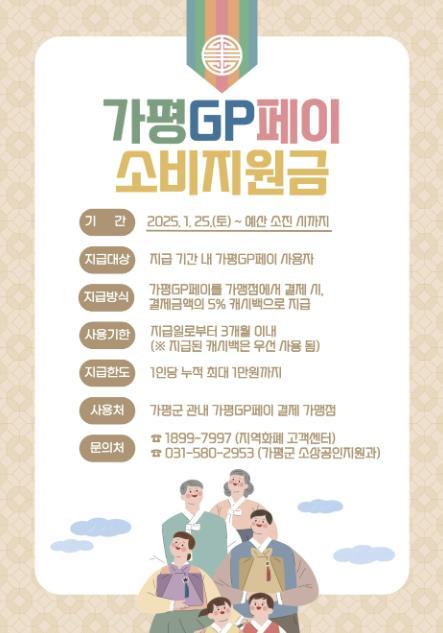 [한국뉴스타임=편집국] 가평군은 설 명절을 맞아 오는 1월 25일부터 지역화폐인 가평GP페이 소비지원금을 지급한다고 밝혔다. 지역경제 활성화를 위한 설맞이 소비지원금 이벤트는 관련 예산 소진시까지 진행된다.