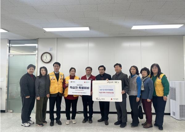 [한국뉴스타임=편집국] 구리시 교문1동주민자치위원회는 지난 22일 재난구호와 취약계층 지원을 위해 사용해달라며 대한적십자봉사회 구리지구 협의회(회장 김복조)에 적십자 특별회비 100만 원을 전달했다.