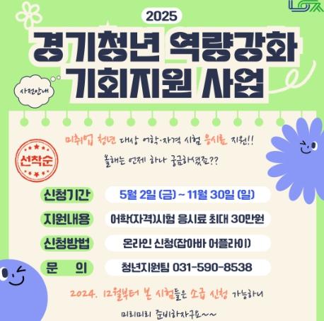 신청일 기준 남양주시에 주민등록을 둔 19~39세 미취업 청년이라면 누구나 신청 가능하며, 1인당 연간 최대 30만 원을 지원한다.