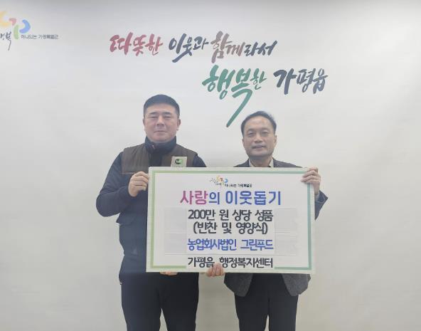 [한국뉴스타임=편집국] 가평읍 행정복지센터는 최근 농업회사법인 그린푸드와 ㈜베베쿡에서 200만 원 상당의 반찬과 이유식을 기탁했다고 밝혔다.