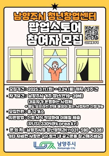 [한국뉴스타임=편집국] 남양주시는 청년 창업가들이 자유롭게 사업을 홍보하고 창업을 경험할 수 있도록 청년창업센터 팝업스토어 참여 사업자를 11일부터 공개 모집한다.