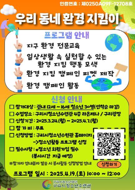 [한국뉴스타임=편집국] 구리시청소년재단 청소년수련관은 청소년 환경 인식 제고와 실천 활동 지원을 위하여 4월 19일 구리시청소년수련관 4층 라온제나와 구리광장에서 청소년 인증프로그램 ‘우리 동네 환경지킴이’를 운영한다.
