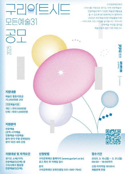 (재)구리문화재단은 구리시민의 문화 향유 확대와 예술 활성화를 위한 예술인지원사업 ‘2025 구리아트시드(모든예술31)’공모를 오는 3월 31일까지 접수받는다고 밝혔다.