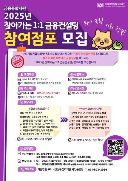 [한국뉴스타임=편집국] 구리시상권활성화재단은 금융 분야에 취약한 소상공인을 위해 맞춤형 진단과 컨설팅을 지원하는'2025년 찾아가는 1:1 금융컨설팅'을 오는 4월 1일부터 시행한다.