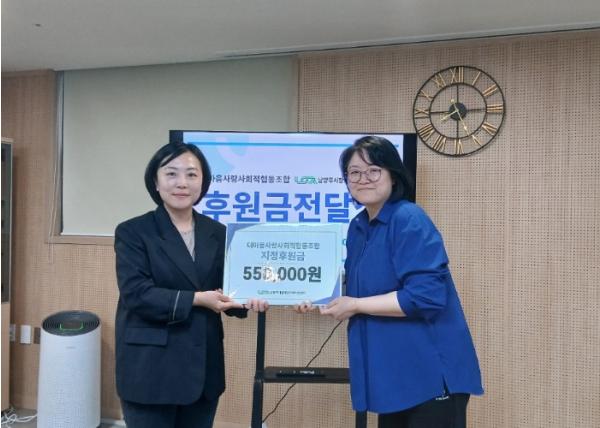전달식에는 남양주시장애인가족지원센터 배애련 센터장과 더마음사랑 사회적협동조합 김민서 대표 등이 참석해 나눔의 의미를 함께했으며, 후원금은 우리 시 발달장애인 부모상담 제공기관을 이용해 심리상담을 받고 있는 장애인 가족의 정서 지원에 사용될 예정이다.