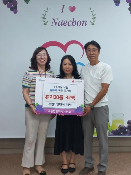 서정아 내촌면장은 “지역사회를 위한 따뜻한 나눔에 앞장서 주신 알맹이 캠핑에 감사드린다”며, “기탁받은 물품은 관내 복지 사각지대에 놓인 이웃들에게 소중히 전달하겠다”고 말했다.