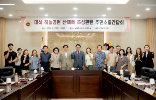 [한국뉴스타임=편집국] 남양주시의회는 19일 시의회 소회의실에서 ‘마석 하늘공원 산책로 조성’에 따른 주민 의견수렴을 위한 소통 간담회를 개최했다.