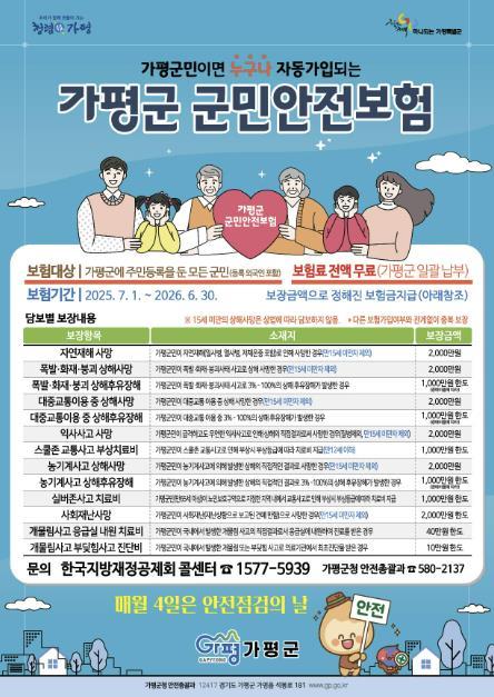 [한국뉴스타임=편집국] 가평군이 각종 재난과 사고로부터 군민을 보호하기 위해 전 주민을 대상으로 한 ‘군민안전보험’에 가입했다고 1일 밝혔다. 이로써 가평군에 주소를 둔 모든 주민(외국인 포함)은 별도의 가입 절차 없이 각종 재난과 사고 관련 보험 혜택을 받을 수 있게 됐다.