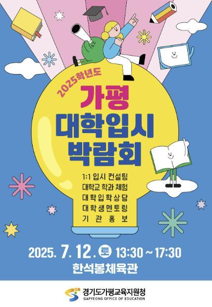 [한국뉴스타임=편집국] 경기도가평교육지원청은 오는 7월 12일 오후 1시 30분부터 5시 30분까지, 가평 한석봉체육관에서 '2025 가평 대학입시박람회'를 개최한다고 밝혔다.