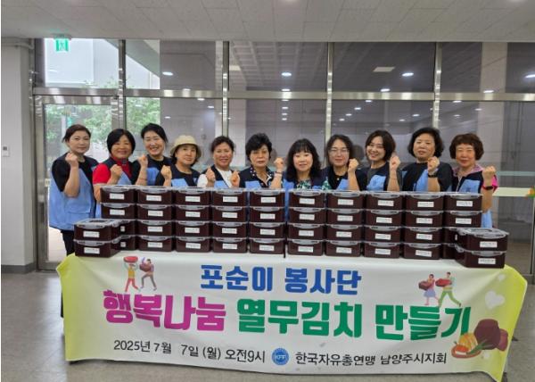 [한국뉴스타임=편집국] 남양주시는 지난 7일 한국자유총연맹 남양주시지회 포순이봉사단이 금곡‧양정 행정복지센터 커뮤니티홀에서 ‘행복나눔 열무김치 만들기’ 행사를 개최했다고 8일 밝혔다.