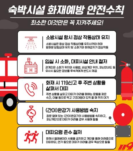소방서는 특히 숙박시설 관계자에게, 투숙객에게 소화기 위치와 피난 안내도· 대피 경로 등의 정보를 사전에 충분히 안내하고, 비상시 엘리베이터 사용 금지 및 대피 시 문 닫기 등 행동요령을 반드시 숙지시킬 것을 강조했다.